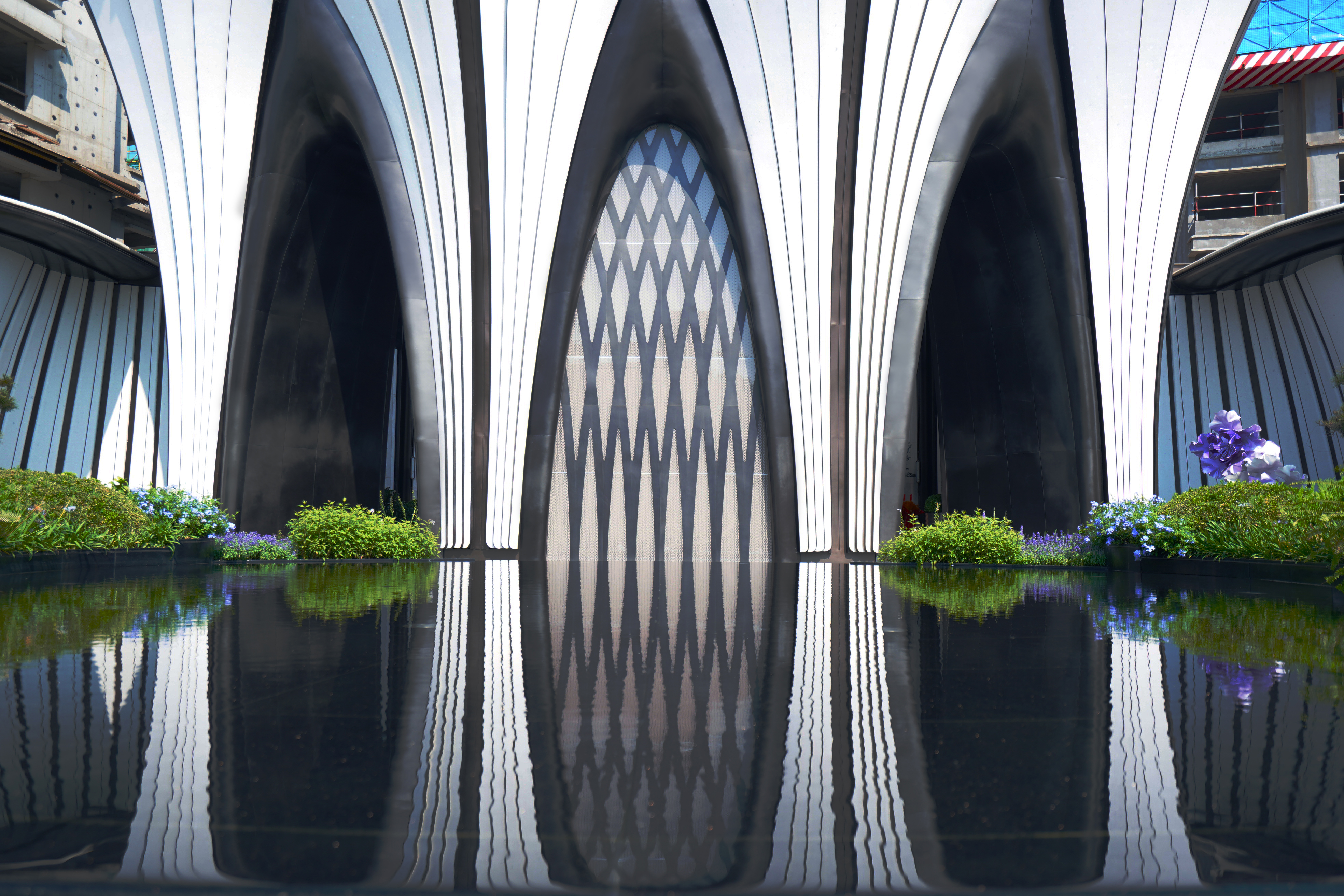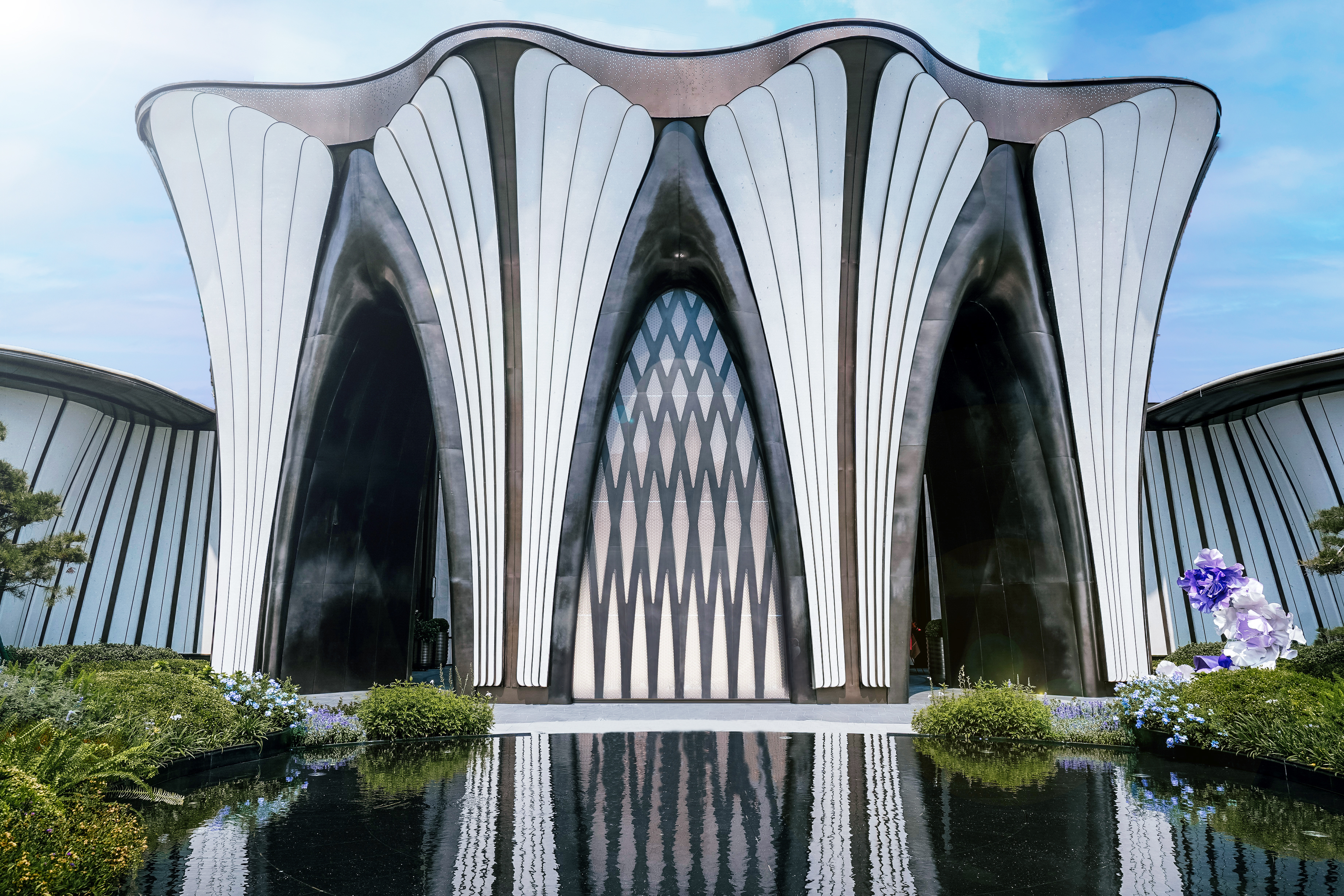 12米高UHPC花瓣造型,以工业级三维建模与纯手工锻造模具精雕曲面,国内首例无缝巨尺度艺术大门,诠释流动的生态韵律。