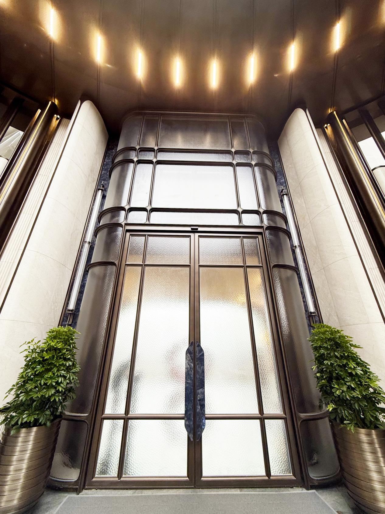 8米通高古铜金属内衬玻璃门,水纹柔化金属质感,四水归堂檐口以现代手法重构东方聚宝盆寓意,雨帘垂落间,财韵与艺术共生。