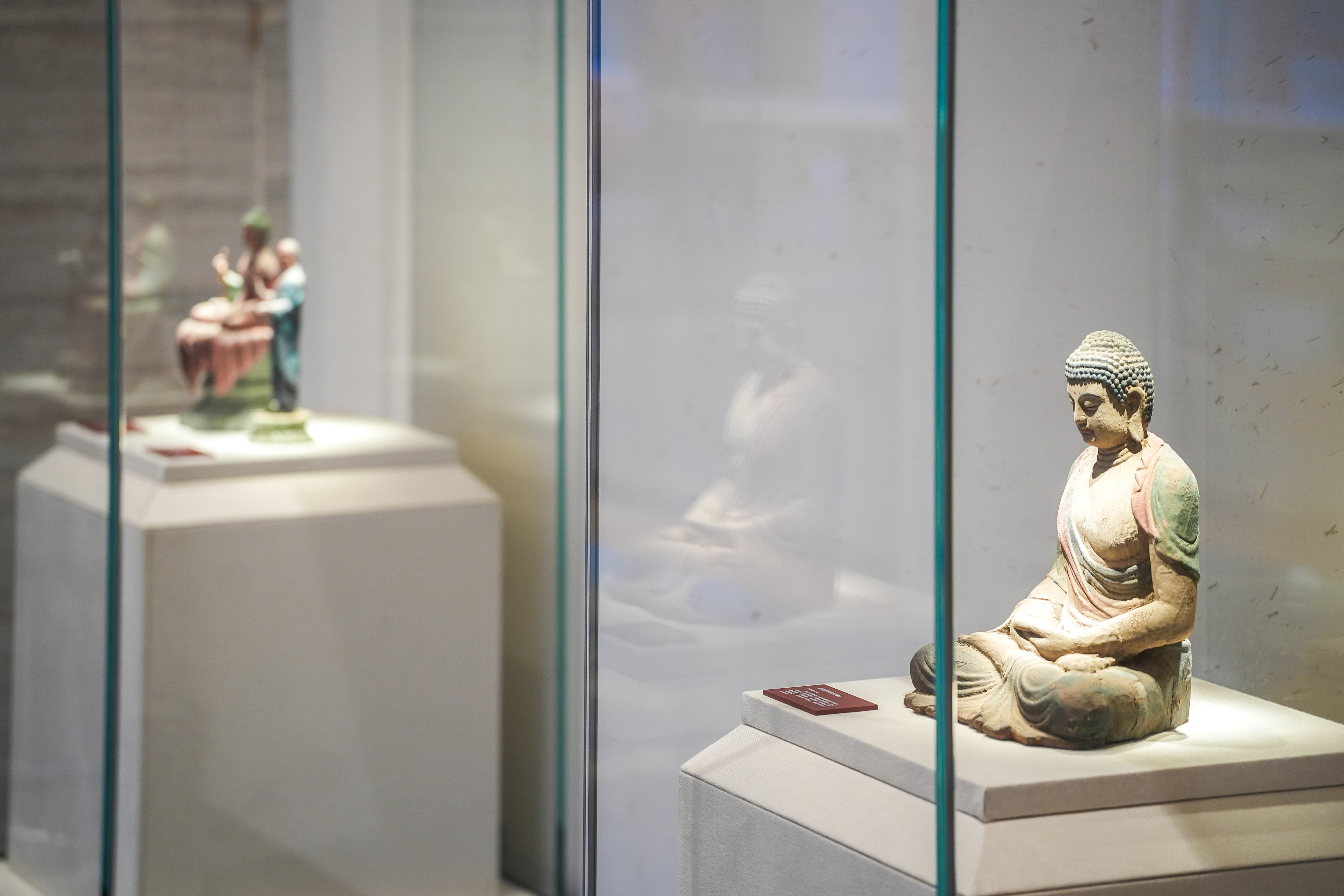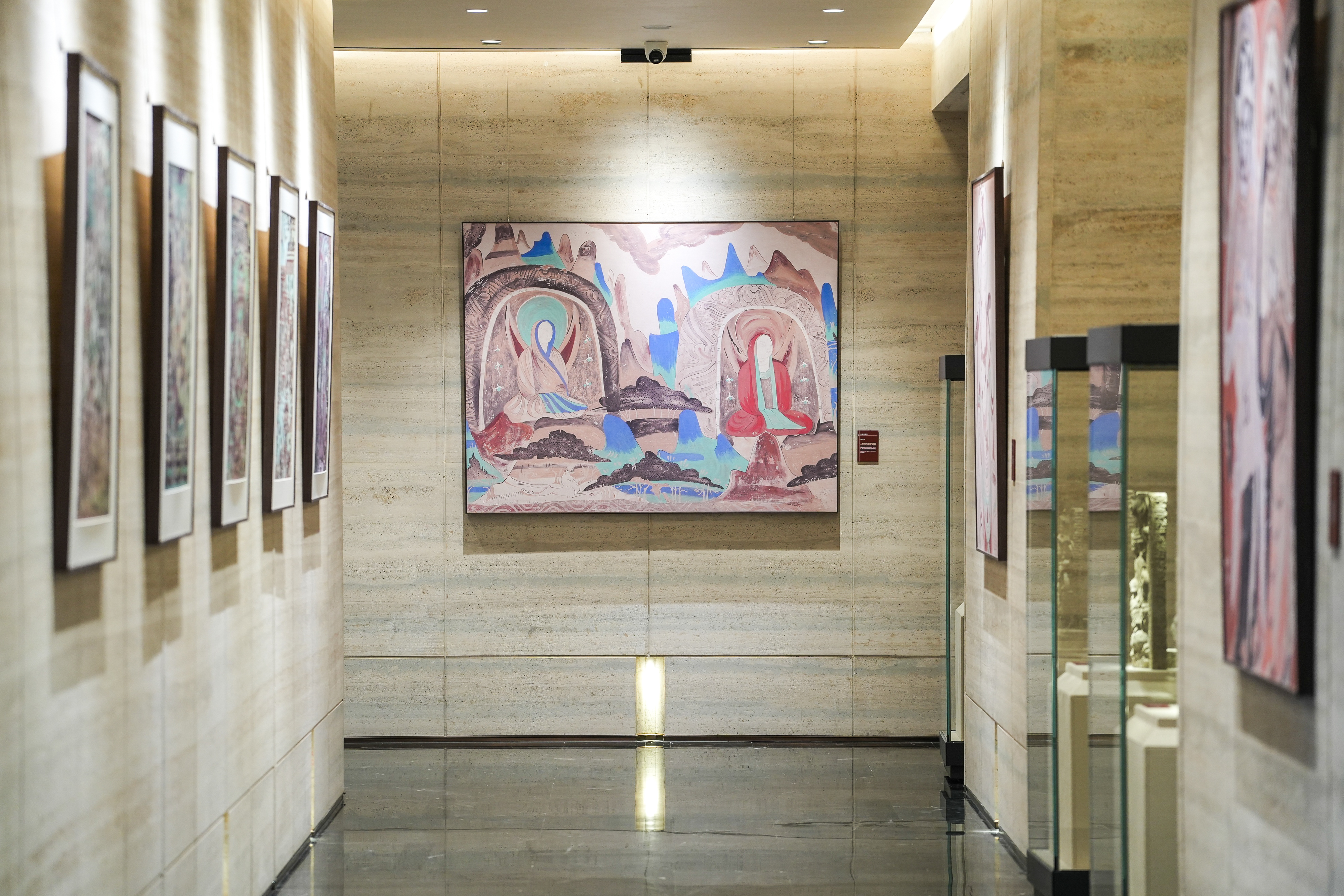 在开阔通透的会客区域,艺术成为社交的底色。光线在精心选配的材质上流淌,营造出温润而松弛的氛围。与之相连的艺术廊道,此刻正化身为“悦鉴溪山 大隐敦煌”特展的主场。行走其间,仿佛穿梭于一条连接古今的美学回廊,让每一次驻足都成为一次精神上的滋养与漫游。