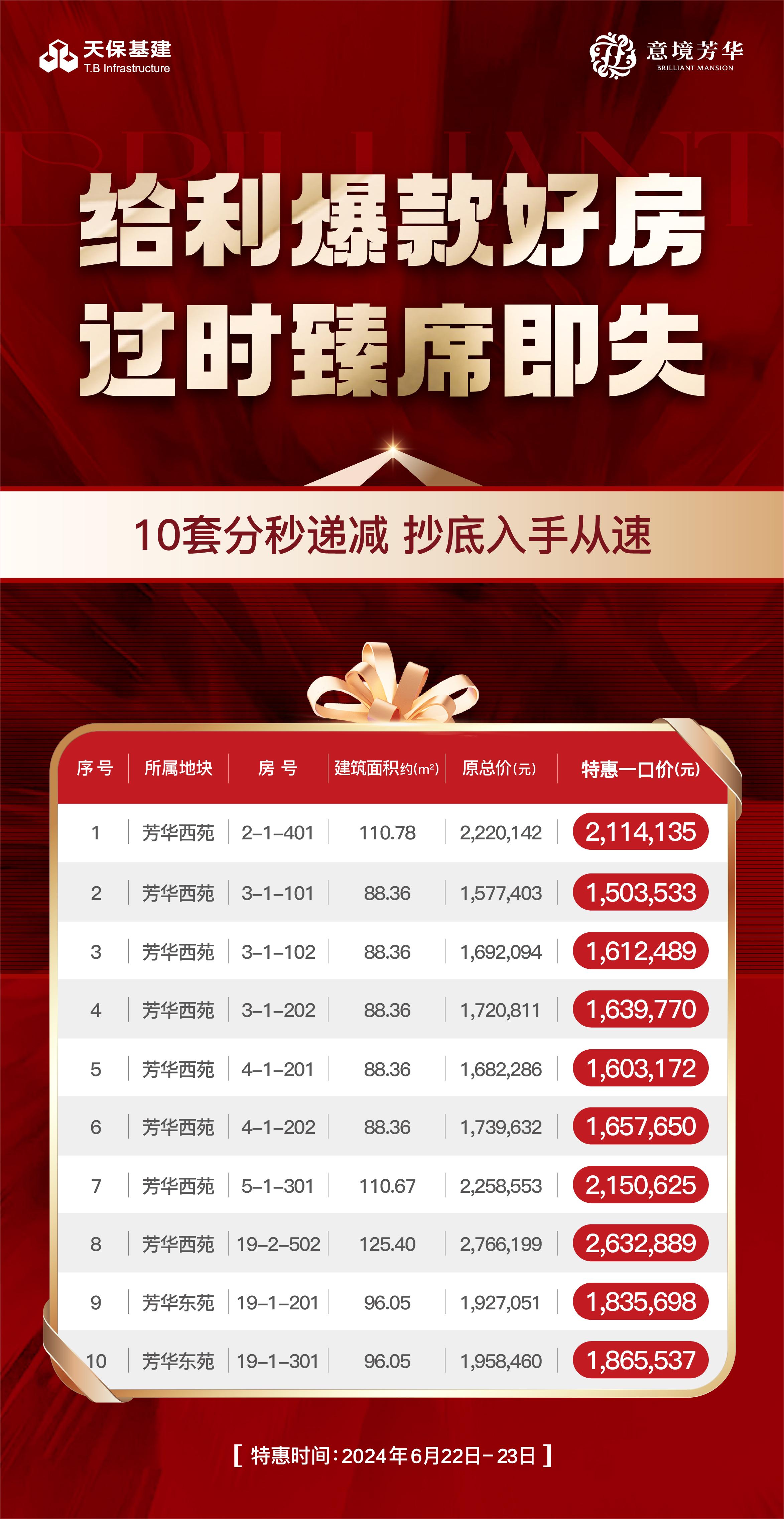 空港核心区域洋房,限时一口价。8套芳华西苑88㎡-125㎡臻选房源,特惠一口价150万起;2套芳华东苑96㎡臻选房源,特惠一口价183万起。数量有限,欲购从速。